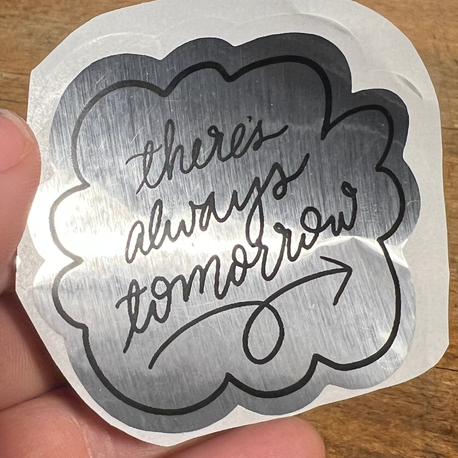 Clocking in at about 2.5 x 2.5 inches, this sticker is a great reminder that we are all works in progress — it says, There’s Always Tomorrow